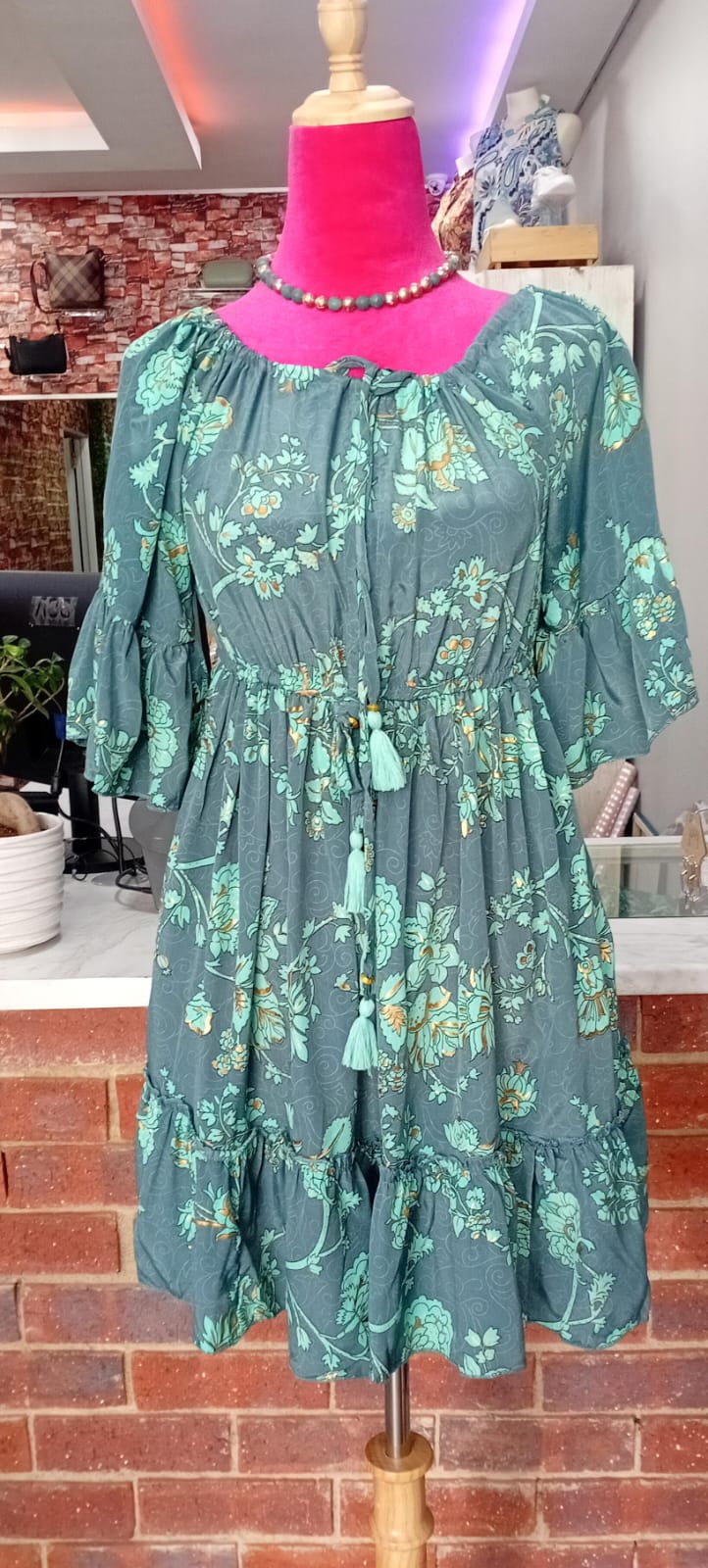 This Mint color summer dress with gold leaf print 3quater sleeves by Stella Morgan is a perfect summer