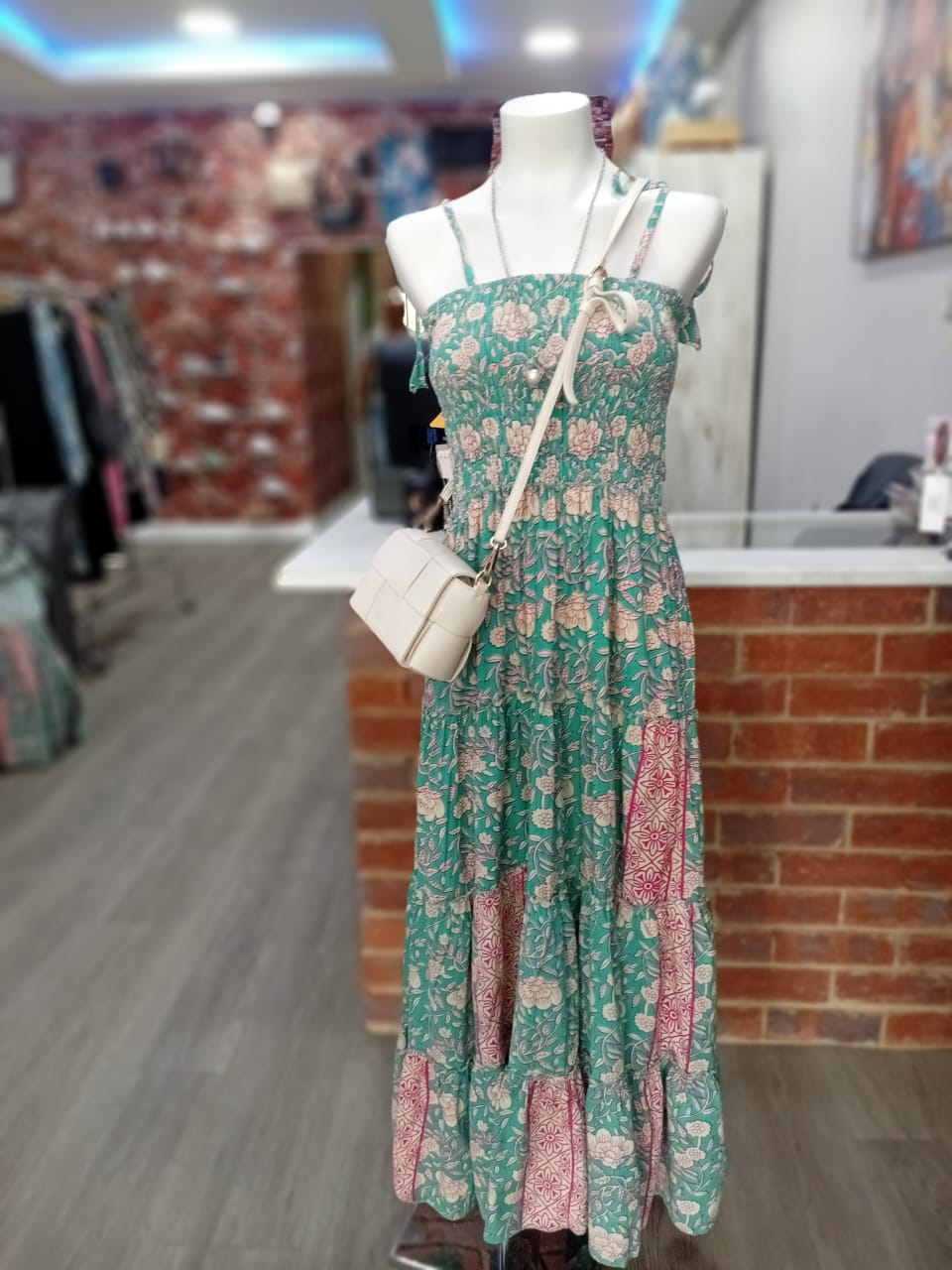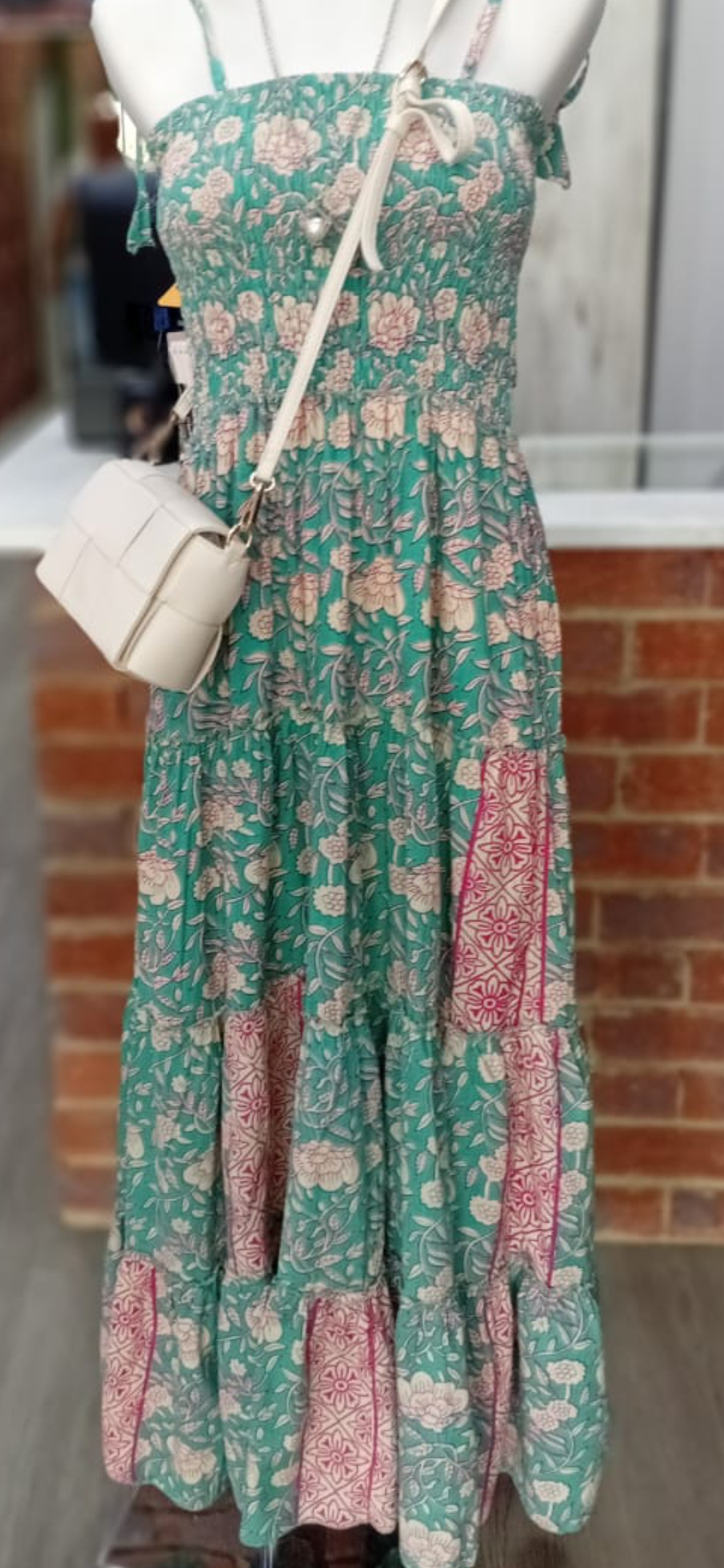 THIS BEAUTIFUL GREEN DRESS WITH PINK AND BEIGE DETAIL PTINT BY STELLA MORGAN BRING OUT THE SOFT DIVINITY WITHIN