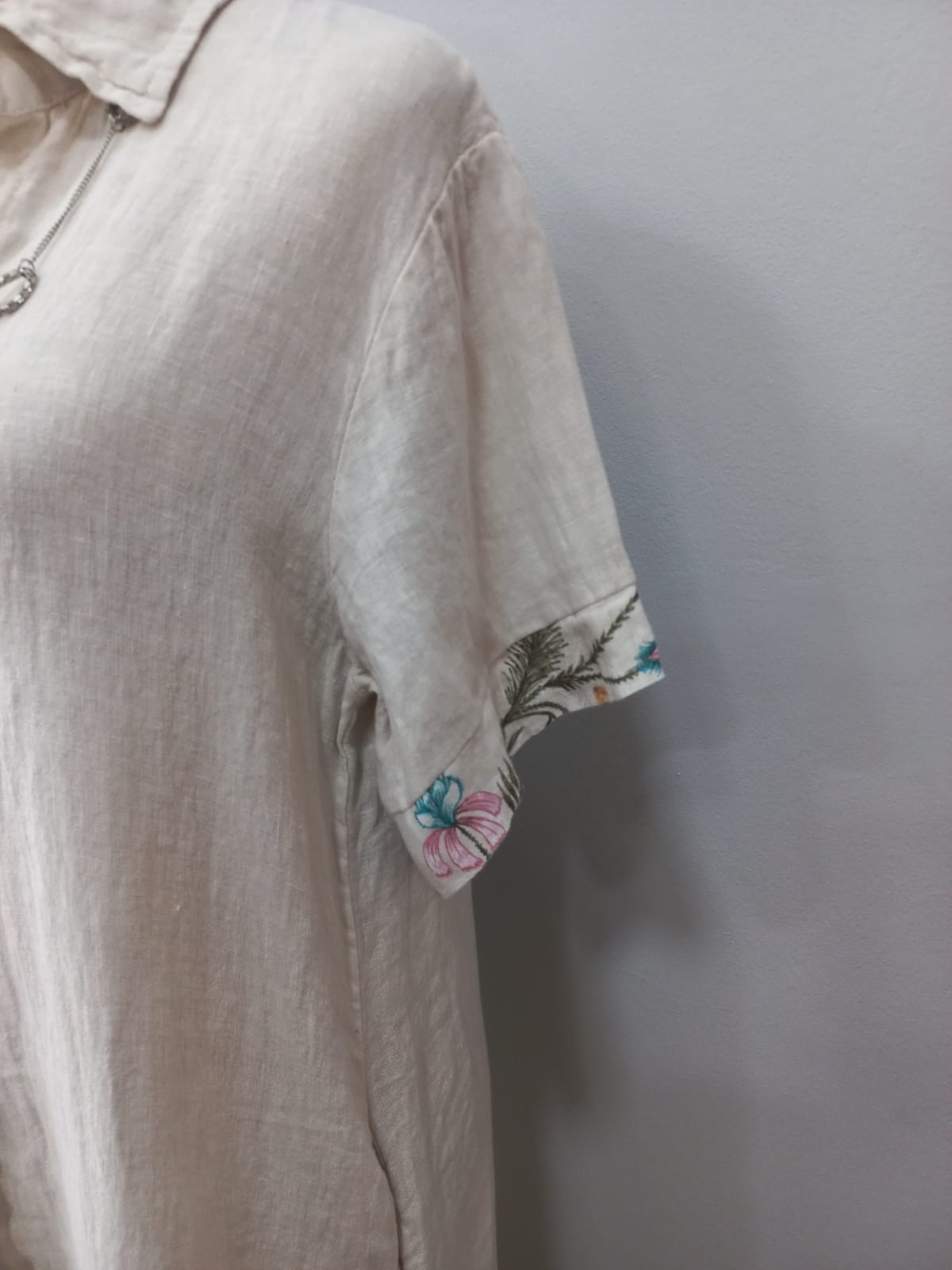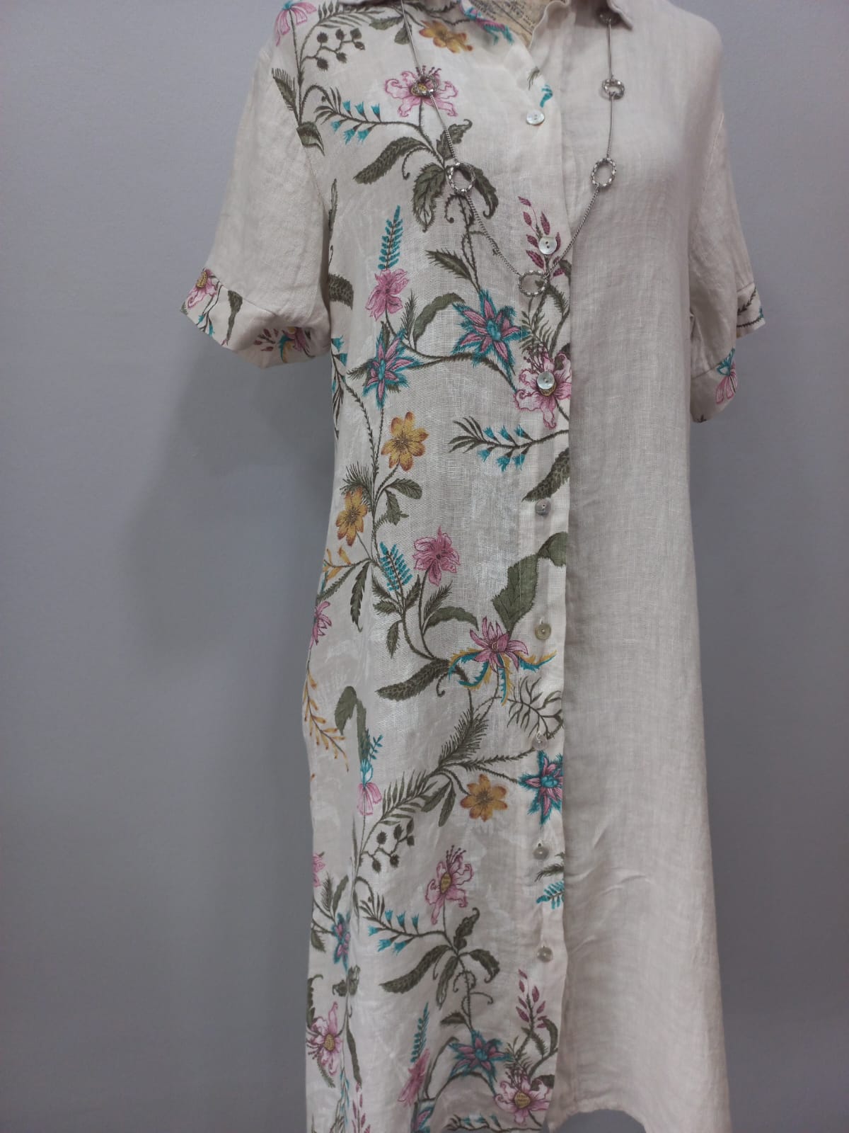 UB CREATIVE ROSA 100%LINEN ONE SIDE FLOWER PRINT LONG DRESS BUTTON DOWN – STONE