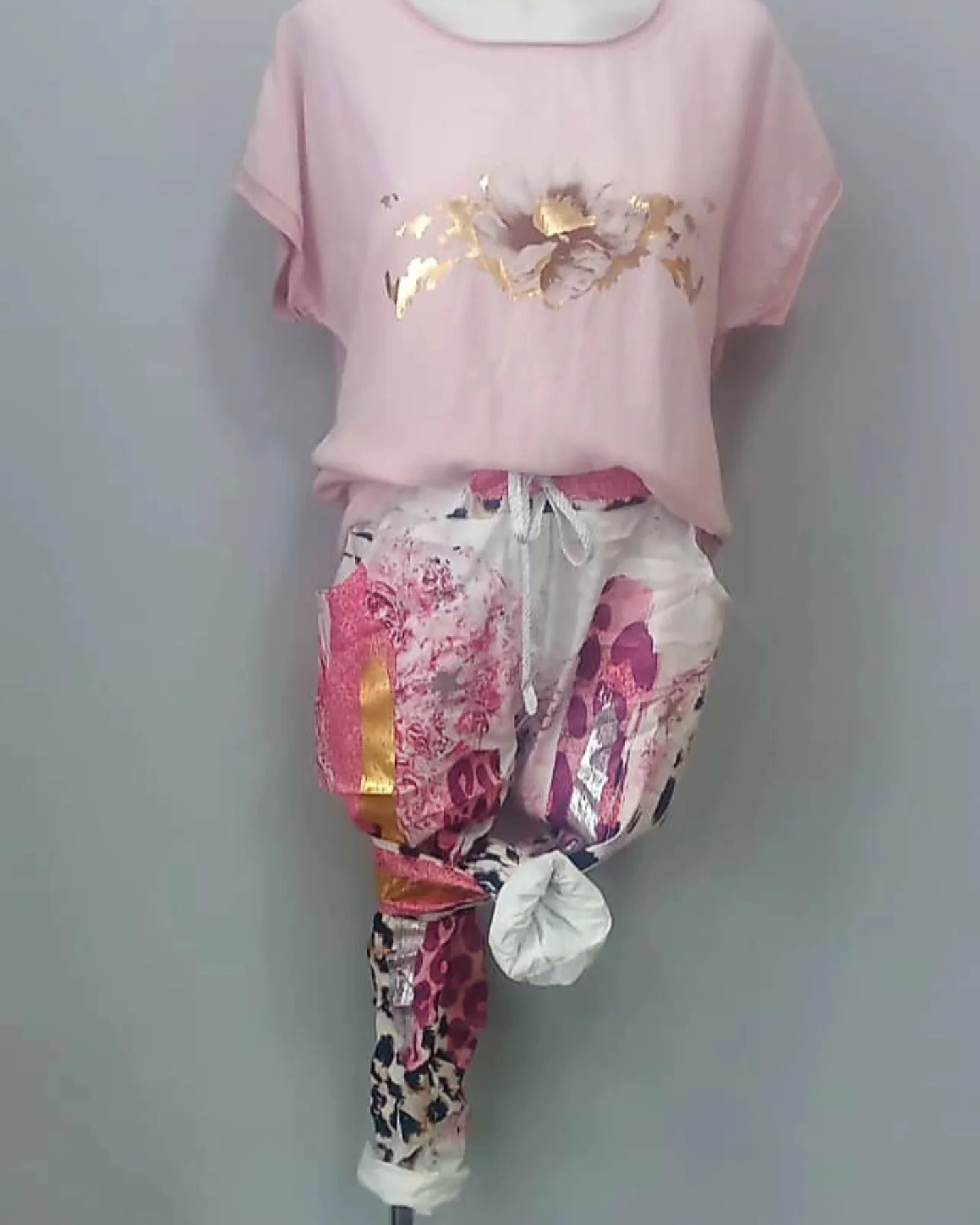 / IT3840A-PINK PRINT VISCOSE FOIL PANTS