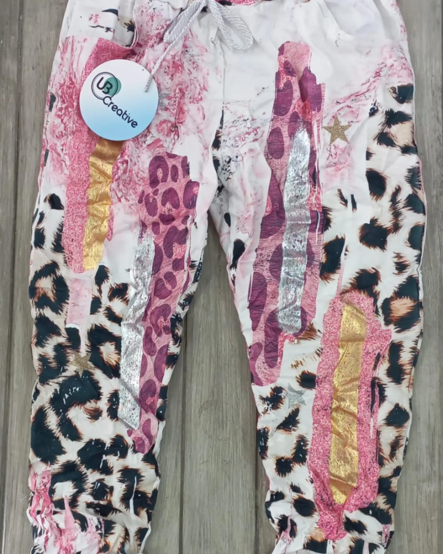 UB CREATIVE PINK PRINT VISCOSE FOIL PANTS WITH LEOPARD PRINT