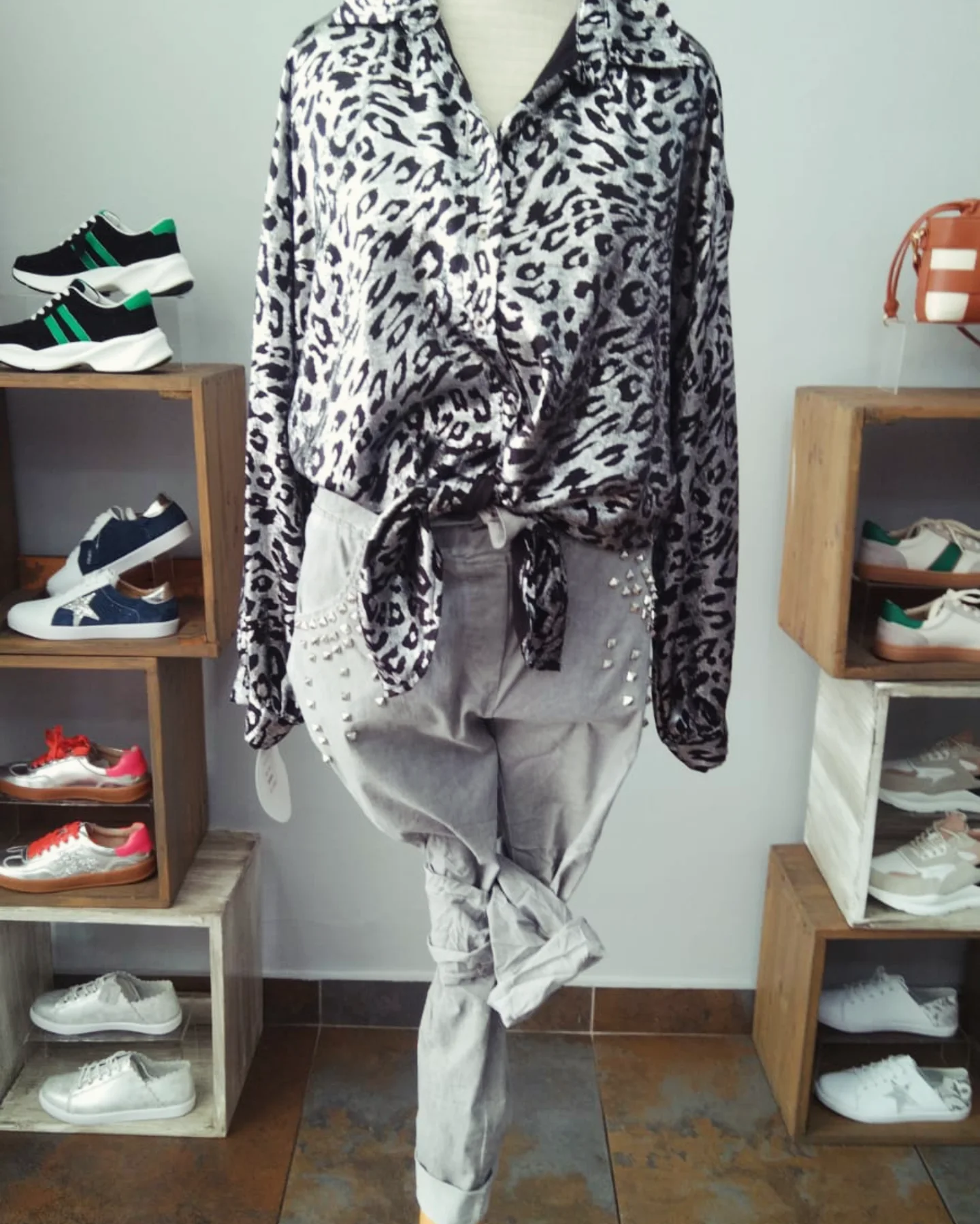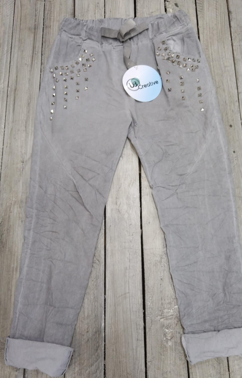 UB CREATIVE ANT GREY VISCOSE STRETCH PANTS WITH ELASTIC WAIST AND STUDS