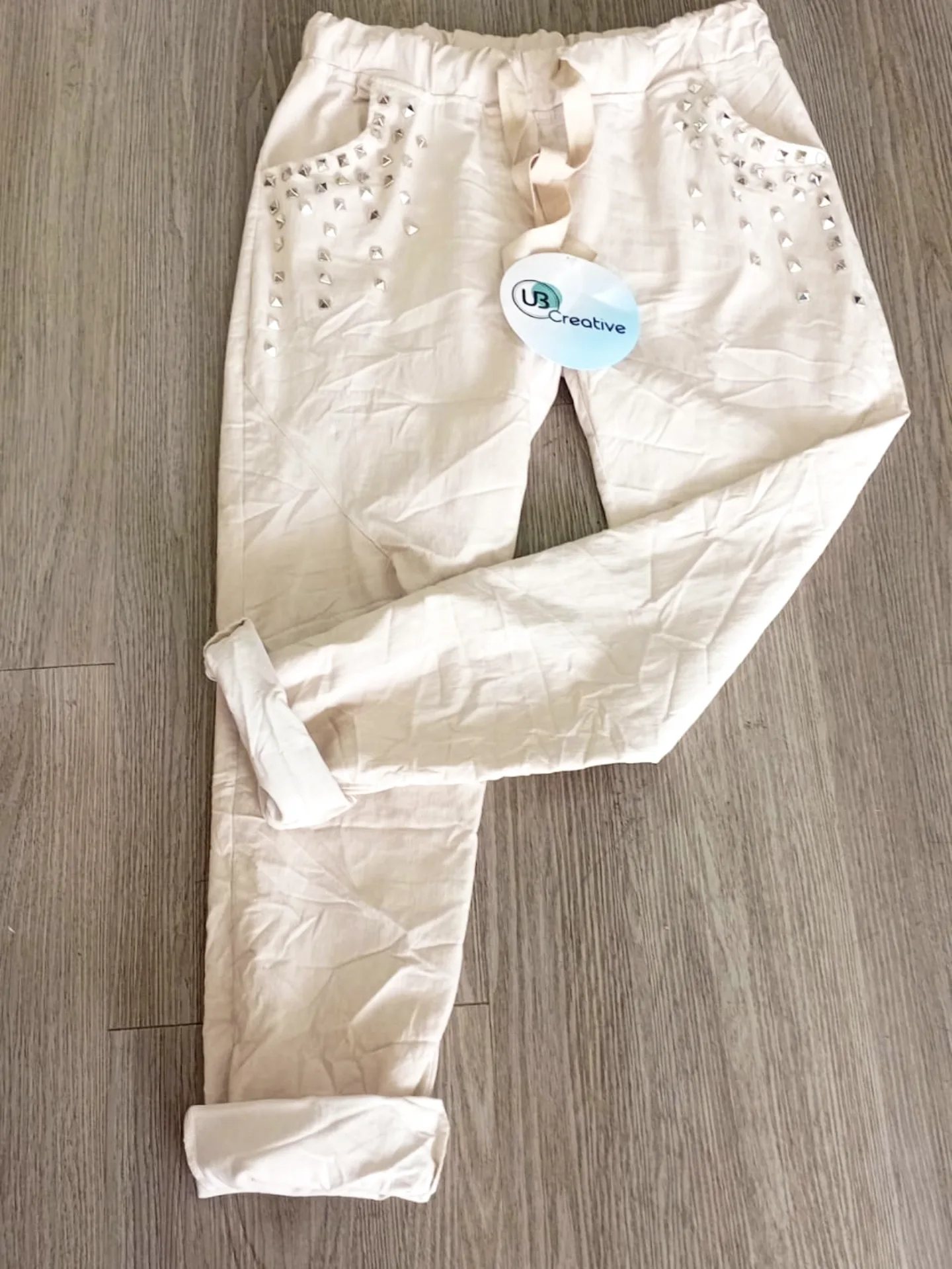 UB CREATIVE know for their stylish unique stretch waist pants brings you this beautiful beige pants with stud detail perfect for dressing up or down