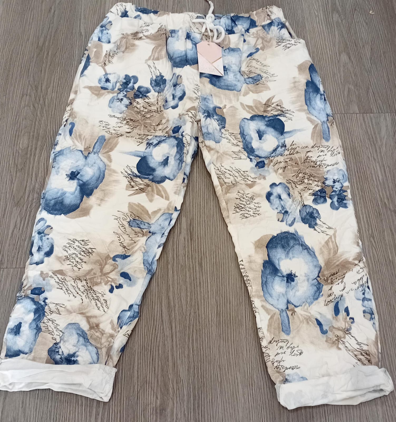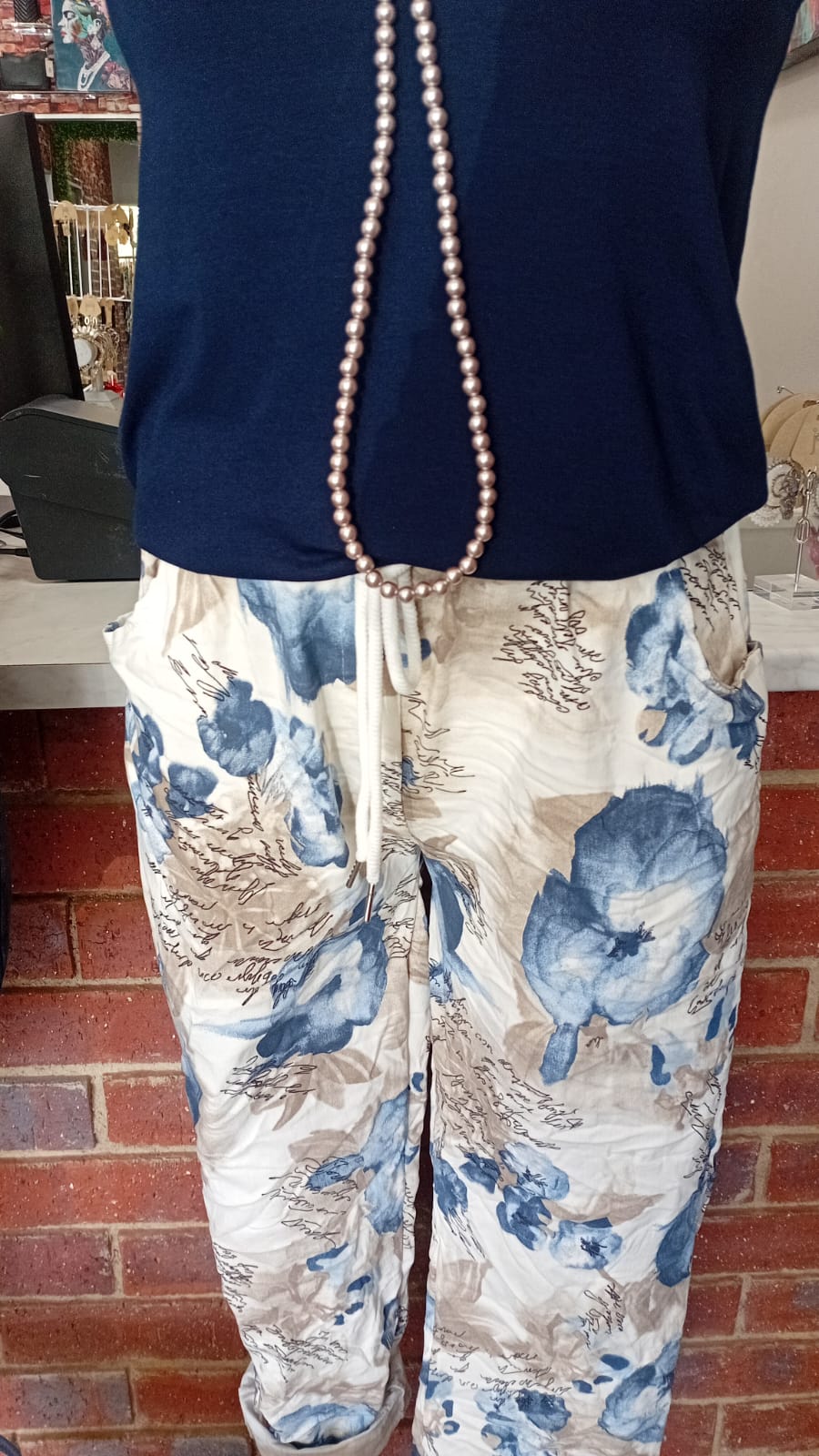BLUE WHITE AND BROWN FLOWER PRINT STRETCH WAIST BAND PANTS BY STELLA MORGAN