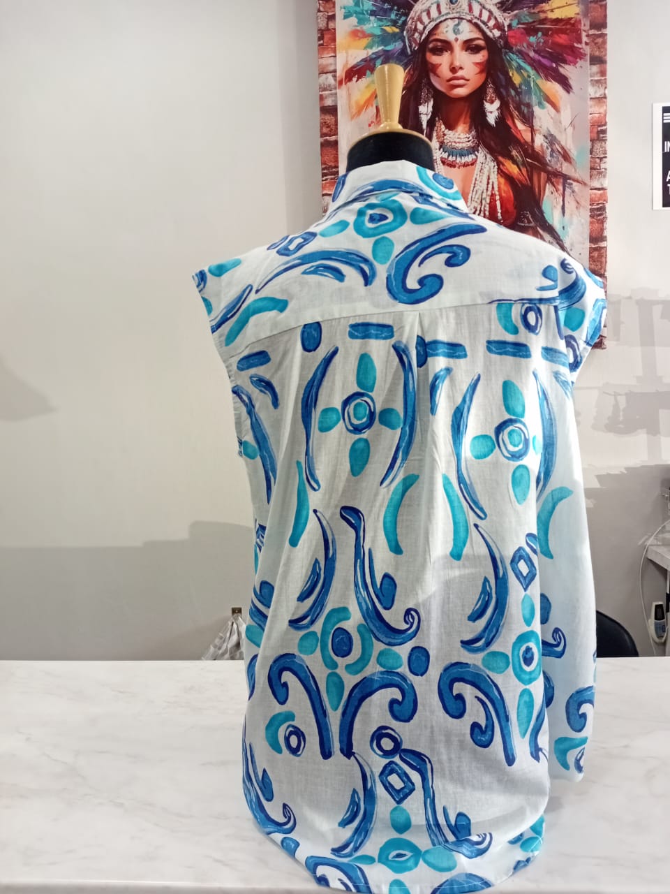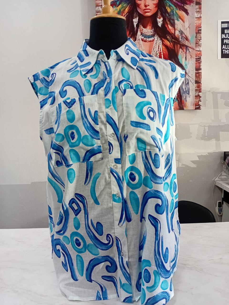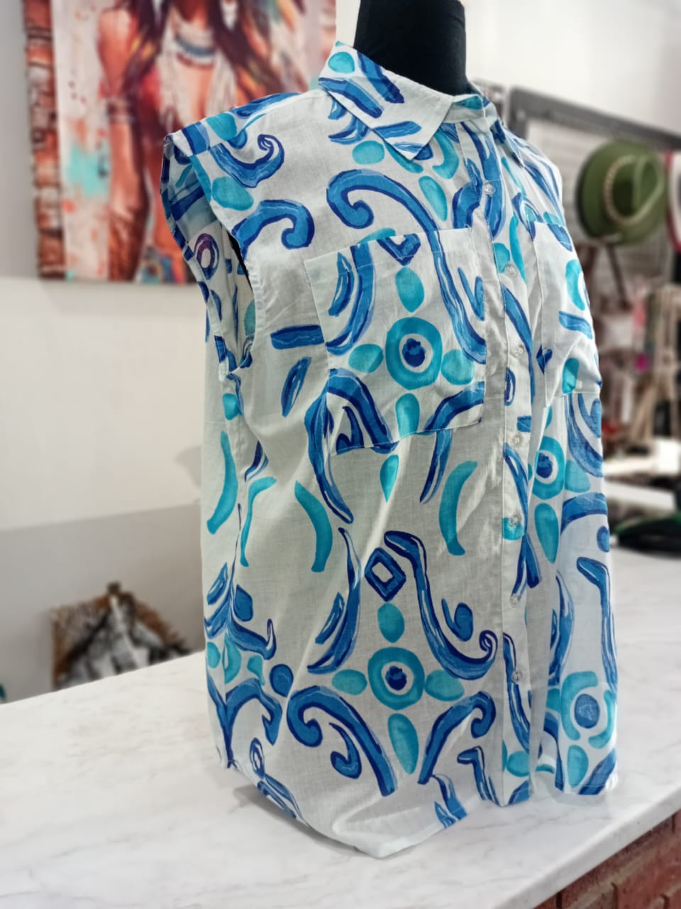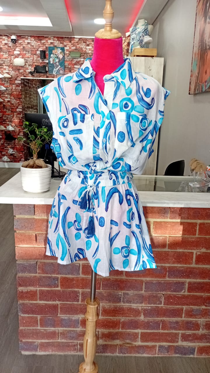 Blue and white print top by STELLA MORGA is a perfect holiday outfit (shorts sold separately)
