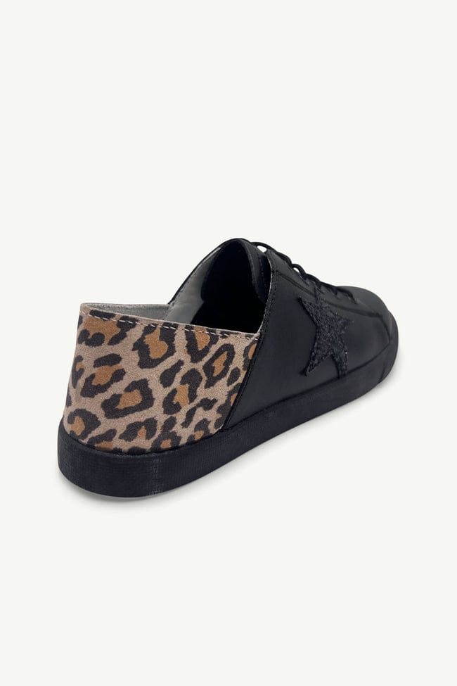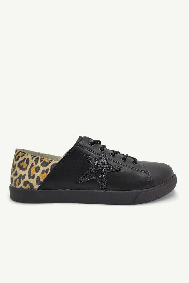 Julz Vici Black Leather Sneakers with Animal Print Heal and Black Glitter Star Detail. Super Cute light as air Julz Shoes brings leather and comfort that can’t be compared